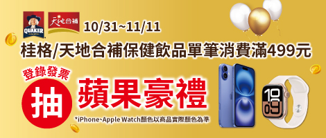 活動期間內,於愛買購買桂格/天地合補全系列,折扣後單筆滿999元,上網登錄發票等購買資訊,即可參加抽獎...