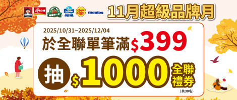 活動期間內,於大全聯(原大潤發)購買桂格/天地合補/福樂/得意的一天/加倍佳/曼陀珠全系列,折後扣單筆滿399元...