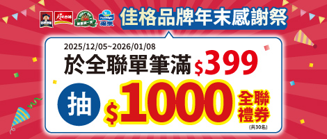 於活動期間內於全聯購買桂格/天地合補/福樂(不含冷藏)/得意的一天/加倍佳/曼陀珠全系列商品單筆滿$399元,憑發票號碼上網...
